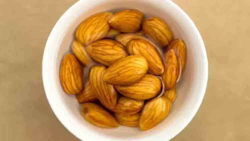 भीगे बादाम खाने का सही तरीका – रात में 5 से 10 बादाम एक कटोरी पानी में भिगो दें। सुबह छिलका उतारकर खाली पेट खाएं।