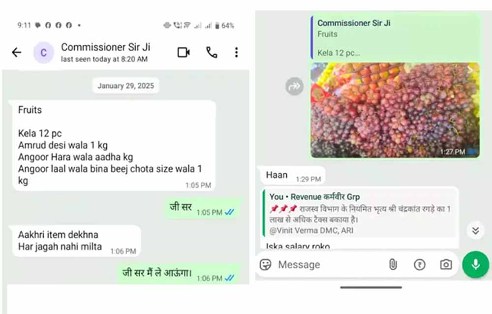 परेशान कर्मचारी ने न्याय के लिए हाईकोर्ट की शरण ली, जिस पर हाईकोर्ट के जस्टिस पीपी साहू ने कर्मचारी के खिलाफ अनुशासनात्मक कार्रवाई पर रोक लगा दी है। दरअसल, दुर्ग नगर निगम में असिस्टेंट ग्रेड-3 भूपेंद्र गोइर ने एडवोकेट संदीप दुबे और मानस वाजपेयी के माध्यम से हाईकोर्ट में याचिका दायर की है। कर्मचारी ने याचिका के साथ वाट्सएप चैट्स के स्क्रीनशॉट हाईकोर्ट में पेश किए हैं। जिसमें निगम कमिश्नर सुमित अग्रवाल ने कर्मचारी से कई बार निजी फरमाइश की, इसमें लाल अंगूर, सेब, संतरा समेत कई फल, 10 किलो जवा फूल चावल, मूवी की कार्नर सीट की दो टिकट, गैस सिलेंडर, बंगले के लिए एसी समेत कई मांग की। इसके अलावा एमआईसी को स्थगित करने पर भी सवाल पूछे।