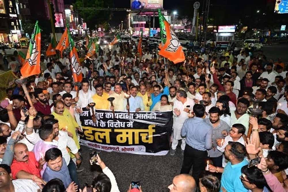 मशाल जुलूस निकाल कर जताया विरोध- वहीं पहलगाम आतंकी हमले के विरोध में गुरुवार शाम भाजपा ने न्यू मार्केट इलाके में मशाल जुलूस निकाला। भाजपा प्रदेश अध्यक्ष वीडी शर्मा की अगुवाई में निकले मशाल जुलूस में भाजपा नेताओं के साथ बड़ी संख्या में लोगों ने न्यू मार्केट के नानके पेट्रोल पंप से रोशनपुरा चौराहे तक पैदल मार्च किया औऱ रोशनपुरा चौराहे पर पहुंचकर आतंकवादी घटना का विरोध जताया और दो मिनट का मौन रखकर मृतकों को श्रद्धांजलि अर्पित की।