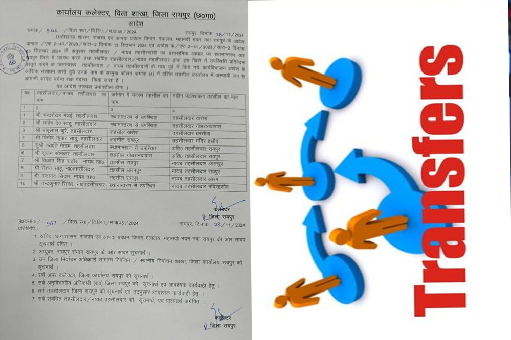 छत्तीसगढ़ कलेक्टर ने जारी किया आदेश, नायब तहसीलदार और तहसीलदारों का तबादला Current News TV January 17, 2025 Share on Social Mediaरायपुर. रायपुर कलेक्टर गौरव सिंह ने जिले में पदस्थ कई तहसीलदार और नायब तहसीलदारों का तबादला आदेश जारी किया गया है. कलेक्टर की तरफ से जारी आदेश के मुताबिक 6 तहसीलदार और 4 नायब तहसीलदारों के प्रभार में फेरबदल किया गया है.