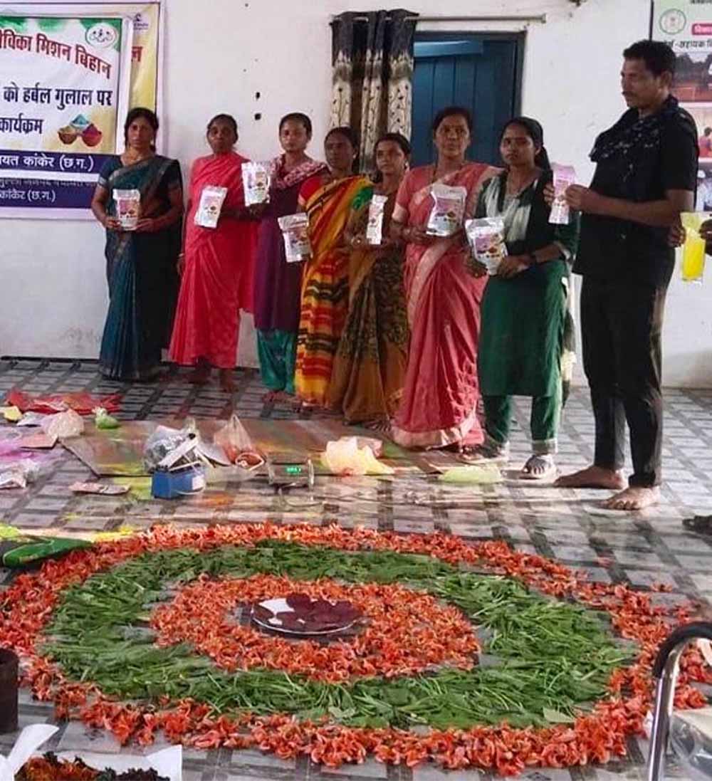 छत्तीसगढ़ राज्य ग्रामीण आजीविका मिशन (बिहान) से जुड़ी महिलाएं आत्मनिर्भर बनकर स्व-सहायता समूहों के माध्यम से हर्बल गुलाल तैयार कर रही हैं। प्राकृतिक फूलों, सब्जियों से बने ये रंग पूरी तरह सुरक्षित और पर्यावरण-अनुकूल हैं। सुगंध के लिए गुलाबजल और प्राकृतिक इत्र का उपयोग किया जाता है, जिससे रंगों की महक भी मन को भा जाती है।