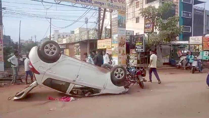 भीषण सड़क हादसा: नशे में धुत युवक ने तेज रफ्तार कार डिवाइडर चढाई, पलटी कार