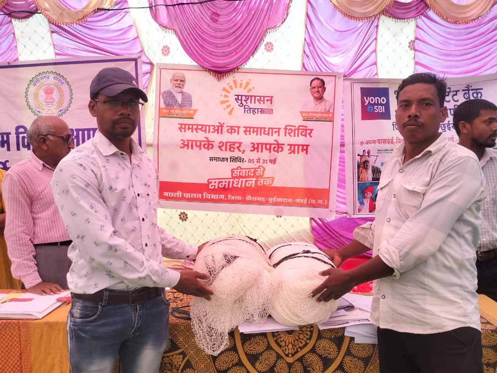 'सुशासन तिहार' के अंतर्गत आयोजित समाधान शिविर में  खैरागढ़ विकासखण्ड के ग्राम खपरी तेली और खपरी सिंदर के दो मेहनती ग्रामीणों, रूपलाल निषाद और राजेश निषाद, के जीवन को नई दिशा दी है। इन दोनों मछुआरों ने मछली पालन के लिए शासन से सहायता प्राप्त करने हेतु समाधान शिविर में आवेदन प्रस्तुत किया। उनकी आवश्यकताओं को गंभीरता से लेते हुए प्रशासन ने ग्राम मुढ़ीपार में आयोजित शिविर में उन्हें तुरंत महाजाल (फिशिंग नेट) प्रदान किया।
