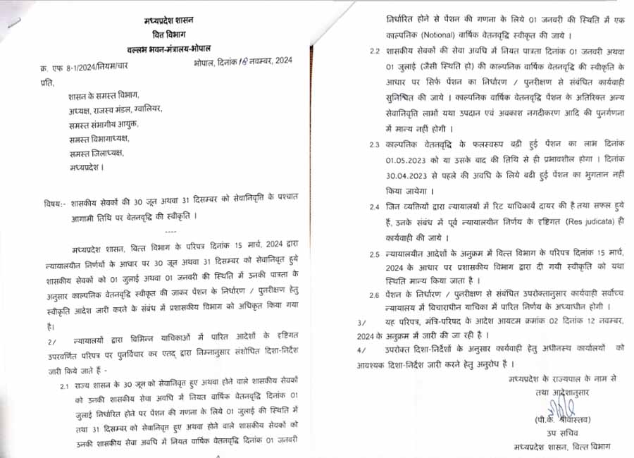 शासकीय सेवकों को 30 जून अथवा 31 दिसम्बर को सेवानिवृत्त के बाद आगामी तिथि पर वेतन वृद्धि स्वीकृत संबंधी आदेश जारी