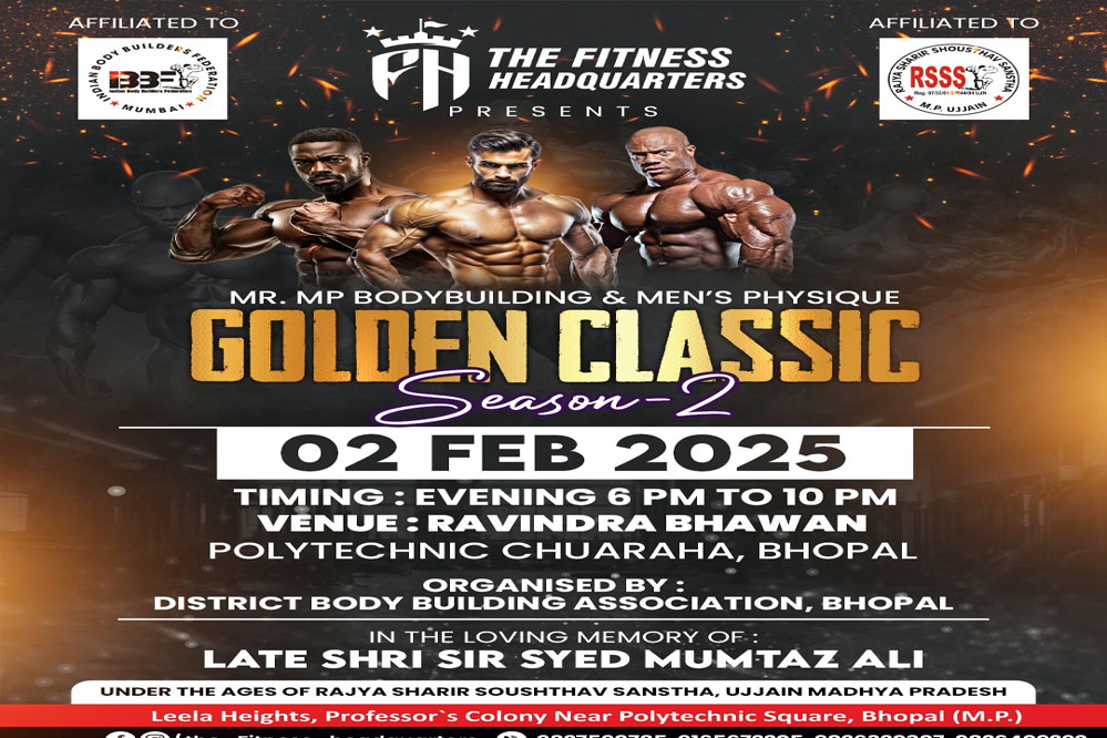 भोपाल जिला बॉडीबिल्डिंग संगठन द्वारा गोल्डन क्लासिक राज्य स्तरीय बॉडीबिल्डिंग एवं  मेन फिजिक चैंपियनशिप का आयोजन रविवार 2 फरवरी 2025 को  किया जा रहा हे l प्रतियोगिता की जानकारी देते हुए भोपाल बॉडीबिल्डिंग के प्रेसिडेंट राजेंद्र रावरिकर एवं कोषाध्यक्ष आशीष टॉक ने बताया की इस प्रतियोगिता में मध्य प्रदेश  के विभिन्न जिलों से लगभग ढाई सौ खिलाड़ी प्रतिभागी होंगे प्रतियोगिता हेतु वजन प्रातः 9:30 से 12:30 बजे तक लिया जाएगा कार्यक्रम स्थल रविंद्र भवन पॉलिटेक्निक चौराहे के पास इस प्रतियोगिता में लगभग ढाई लाख रुपए नगद एवं आकर्षक ट्राफियां प्रदान की जाएगीl