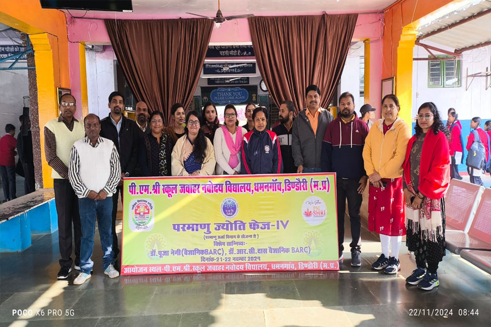 डिंडौरी जिले का अग्रणी पीएम श्री स्कूल जवाहर नवोदय विद्यालय में परमाणु ज्योति फेस 4 के तहत विभिन्न कार्यक्रमों का सफलतापूर्वक आयोजन किया गया। परमाणु ज्योति कार्यक्रम, नवोदय विद्यालय समिति एवं भाभा परमाणु अनुसंधान केंद्र का संयुक्त आयोजन है। भारत सरकार के अधीन परमाणु ऊर्जा विभाग के भाभा परमाणु अनुसंधान केंद्र, मुंबई के तत्वाधान में वैज्ञानिक डॉ. आर. सी. दास, एवं डॉ. पूजा नेगी ने विद्यालय में संगोष्ठी एवं प्रश्नोत्तरी का आयोजन किया। प्रश्नोत्तरी के दौरान परमाणु मित्रों ने विद्यार्थियों को आकर्षक उपहार देकर उनका उत्साह वर्धन किया। उनके द्वारा विद्यालय में विद्यार्थियों के अंदर परमाणु विज्ञान से जुड़े रोचक तथ्यों को प्रदर्शित किया गया एवं विद्यार्थियों को इस क्षेत्र में हो रहे अनुसंधानों के बारे में जानकारी दी।